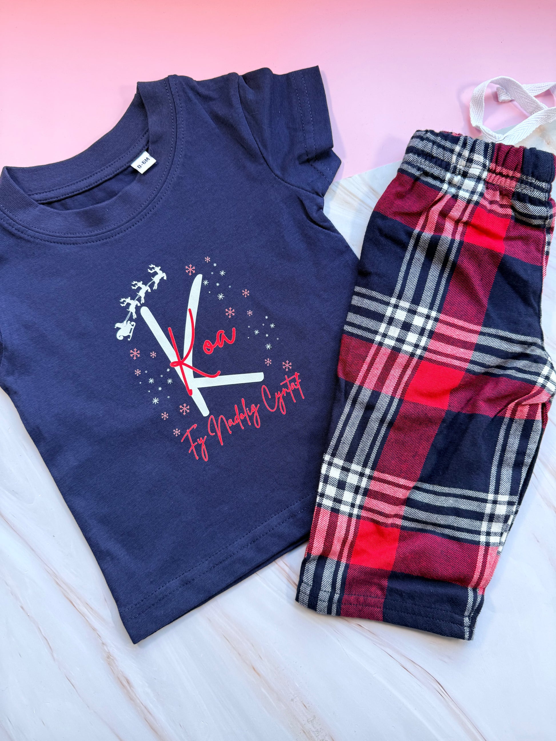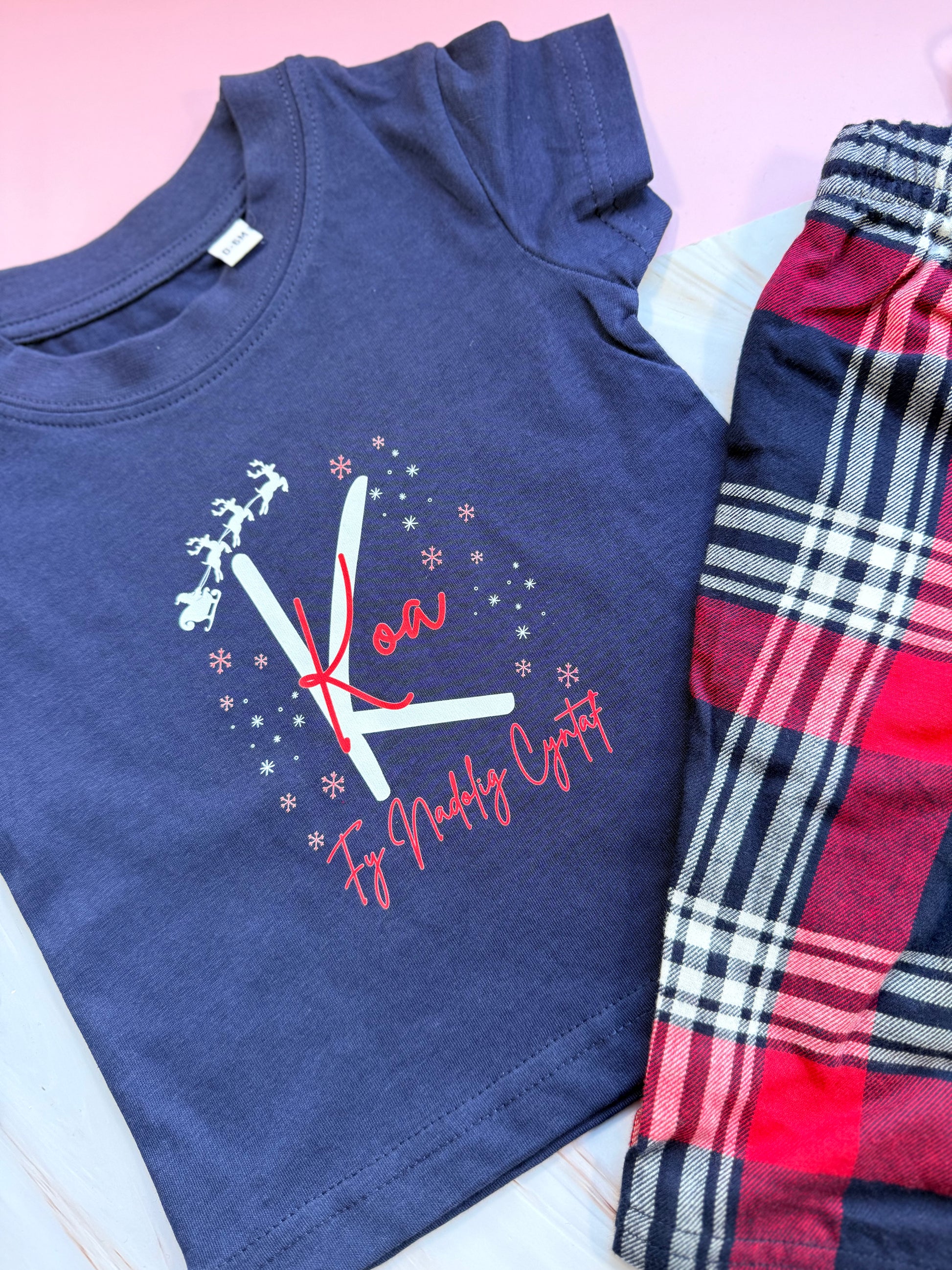 Get the whole family into the festive spirit with these playful Christmas pyjamas! Choose your favorite holiday message—Nadolig Llawen, Merry Christmas, or My First Christmas—in Welsh or English. Customize with a charming Christmas tree background or Santa and his sleigh soaring above your name and initial. Available in sizes from 0-6 months up to adult XXL, these cozy pyjamas bring holiday cheer to everyone, making bedtime a joyful celebration.